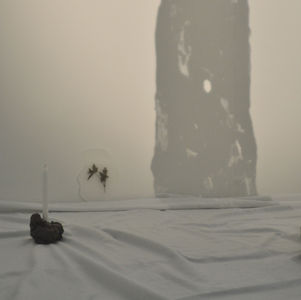 latex, barbed wire, clay, white chiffon curtain, wax, dried flower, candle, broken ceramic mug, mirror, dried rose petals, white cotton sheet